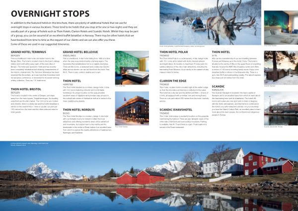 In addition to the featured hotels in this brochure , there are plenty of additional hotels that we use for overnight stops in various locations . These tend to be hotels that you stop at for one or two nights and they are usually part of a group of hotels such as Thon Hotels , Clarion Hotels and Scandic Hotels . Whilst they may be part of a group , you can be assured of an excellent buffet breakfast in Norway . There may be other hotels that we have booked from time to time as the request of our clients and we can also offer you these . Some of these are used in our suggested itineraries .